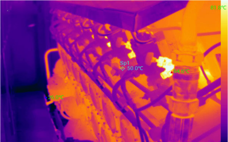 運輸機車由于柴油機高壓燃油管路破裂或泄漏,致使燃油飛濺到渦輪增壓器和排氣管等熱表面而引起機器處所發(fā)生火災(zāi),后果嚴(yán)重。熱像儀能持續(xù)監(jiān)控并計算場景內(nèi)物體每個點的溫度數(shù)據(jù),實現(xiàn)對火災(zāi)的檢測與報警,防患于未“燃”。