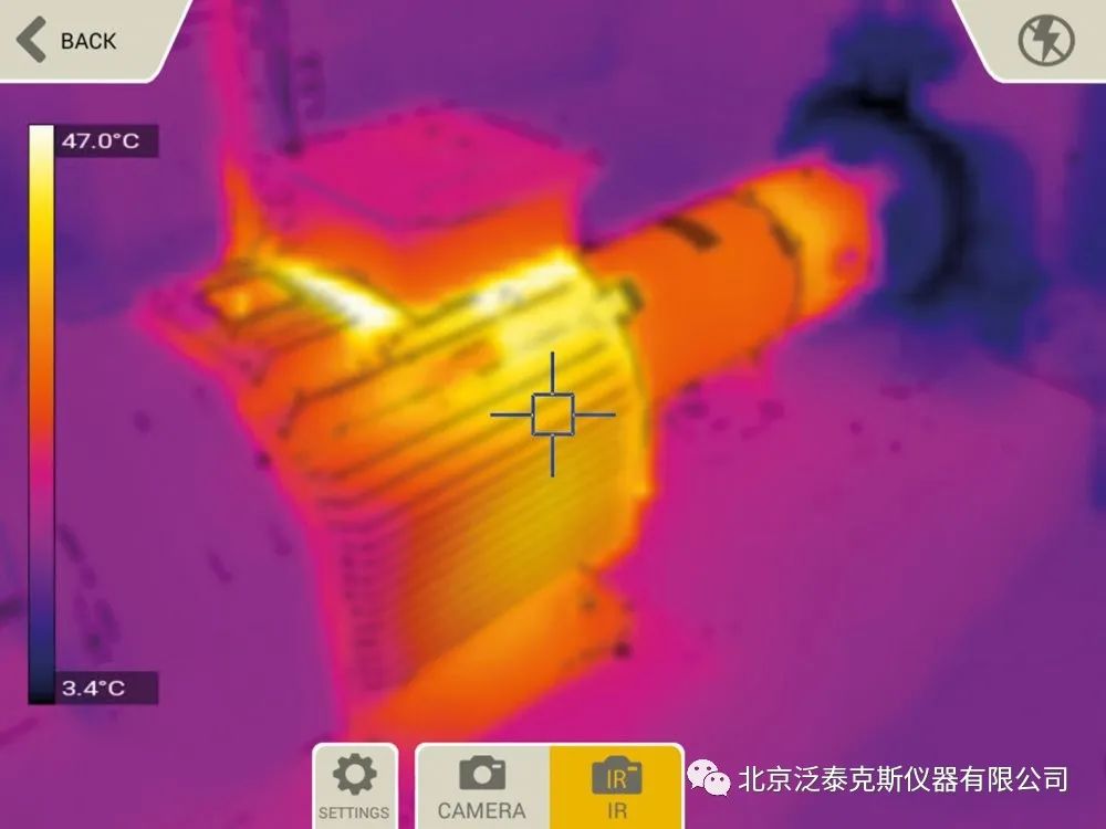 在進(jìn)行測(cè)試的過程中,將泵-電機(jī)組引入不對(duì)中狀態(tài)。在不對(duì)中狀態(tài)期間,通過XT11主機(jī)單元的紅外熱成像功能拍攝了一組照片,來識(shí)別關(guān)鍵部位的溫度情況。在嚴(yán)重不對(duì)中的狀況下,聯(lián)軸器、軸承和機(jī)器外殼都出現(xiàn)了明顯的升溫;當(dāng)重新對(duì)中后,設(shè)備處于正常軸對(duì)中的情況下,元器件逐漸冷卻,并沒有明顯的高溫現(xiàn)象。