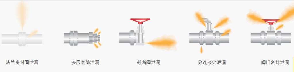 1.管道破裂;2.閥門泄漏;3.墊片泄漏;4.管道焊接不符合要求;
