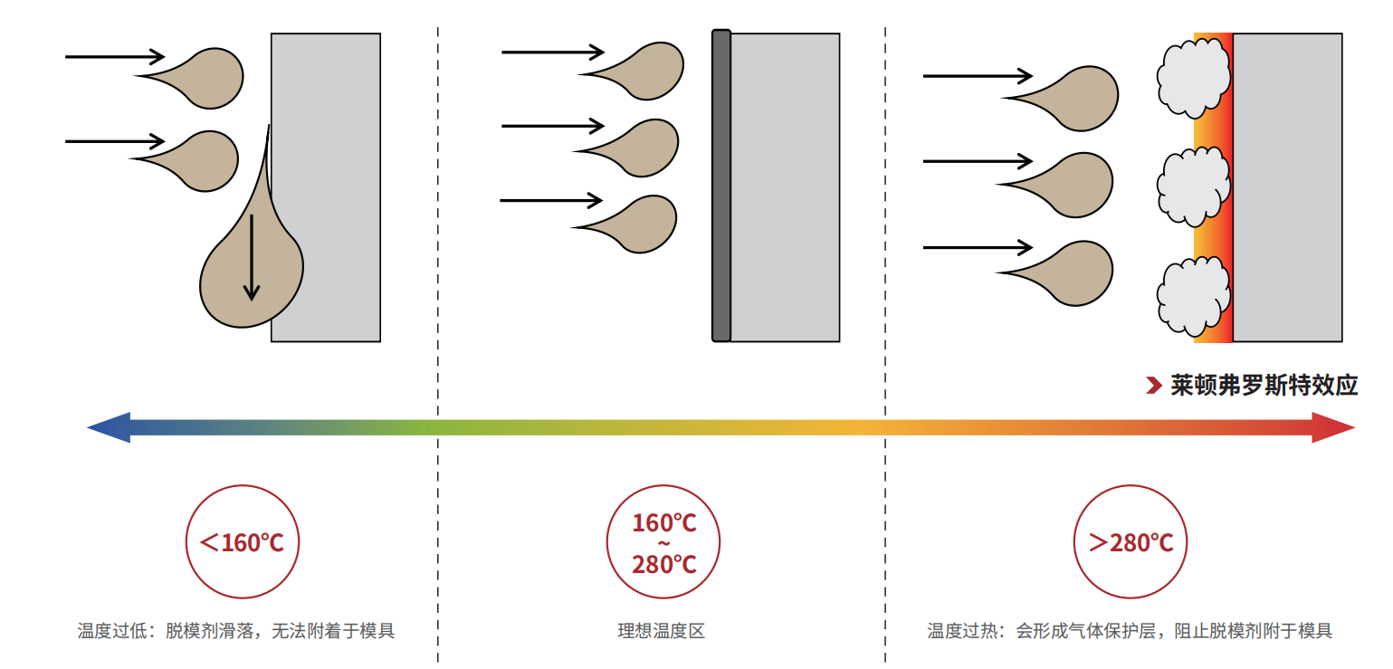 傳統(tǒng)噴涂成膜理想溫度范圍較窄,良好的模溫控制可以使脫模劑附著于模具表面,減少拉傷、粘膜等缺陷