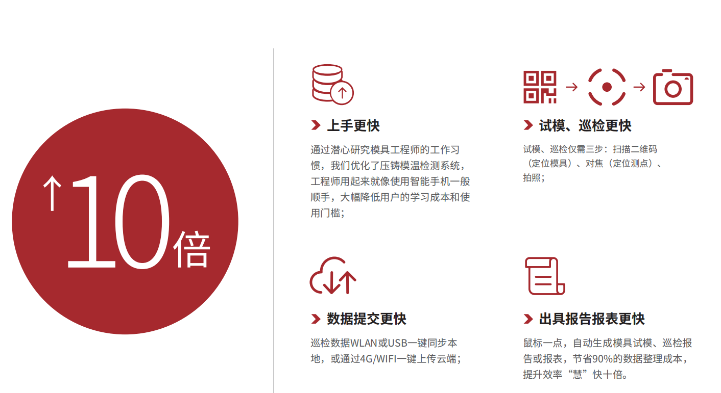 ? ? 基于模溫檢測(cè)概念,我們將壓鑄數(shù)據(jù)管理系統(tǒng)集成于模溫儀,通過(guò)云端將試模、巡檢數(shù)據(jù)與所有參與人員互聯(lián),試模、巡檢數(shù)據(jù)不再是原始的“數(shù)字”或“字符”,而是通過(guò)算法變?yōu)榫哂羞壿嫷臄?shù)據(jù),構(gòu)成有價(jià)值的信息,助力您打造工業(yè)4.0的智能壓鑄工廠。
