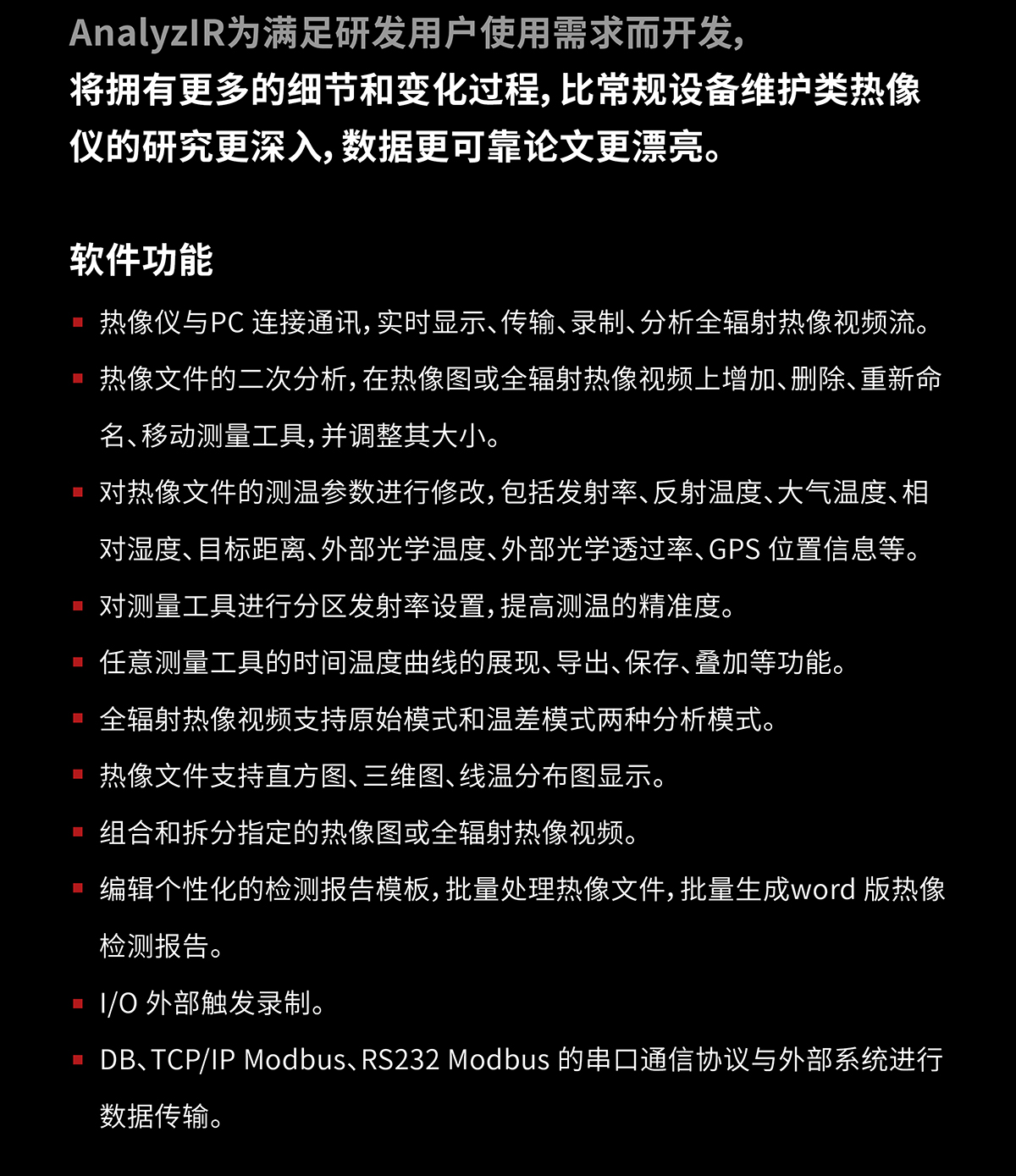 | 測(cè)溫區(qū)域 | 與分析軟件(AnalyzIR)連接,不限制測(cè)溫點(diǎn),測(cè)溫線,測(cè)溫區(qū)域個(gè)數(shù) |