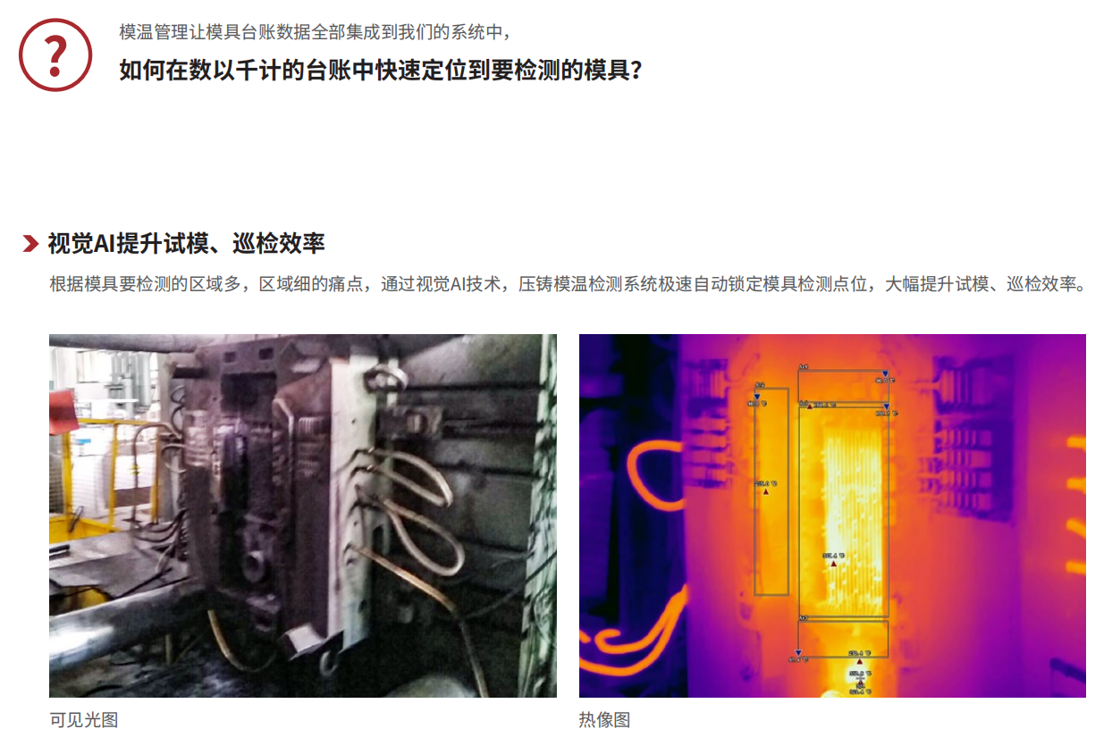 模溫檢測區(qū)域識別 通過視頻技術,模擬自動鎖定模具檢測點位,大幅提升試模、巡檢效率
