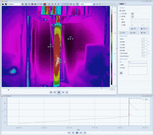 使用FOTRIC 熱像儀,實(shí)時(shí)記錄每一個(gè)溫度數(shù)值,來檢測柔性合金材料最高耐高溫度區(qū)域的變化情況,以此來判斷材料的耐熱性能。