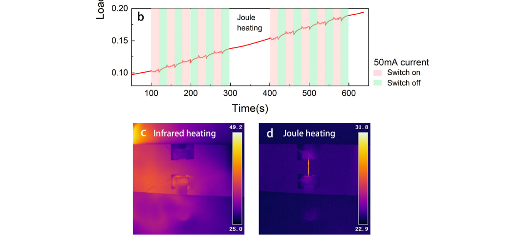碳納米管(CNT)纖維的機(jī)電響應(yīng)(EMR)是碳納米管網(wǎng)絡(luò)的集體收縮行為,該研究提出了一種結(jié)構(gòu)演化機(jī)制來(lái)解釋EMR中的模量損失,使用FOTRIC 熱像儀來(lái)測(cè)溫,比較焦耳加熱與紅外加熱的時(shí)間曲線差異,以此來(lái)探討安培力和熱膨脹對(duì)EMR的影響。