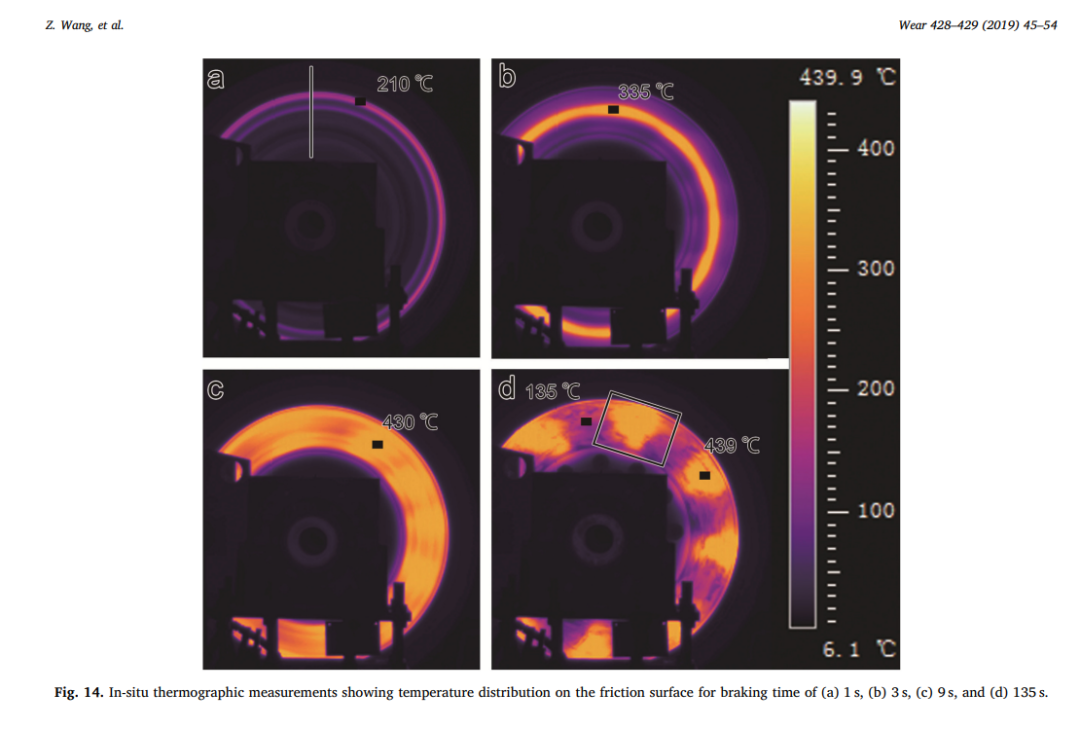 ? ? ? ?制動(dòng)盤連續(xù)制動(dòng)循環(huán),疲勞裂紋的逐漸發(fā)展嚴(yán)重影響著高鐵制動(dòng)。該研究提出了裂紋萌生和擴(kuò)展的機(jī)理,使用FOTRIC 熱像儀,來(lái)檢測(cè)制動(dòng)時(shí)制動(dòng)盤摩擦面上的溫度,以此對(duì)制動(dòng)過(guò)程中摩擦表面存在的熱機(jī)械條件進(jìn)行分析。