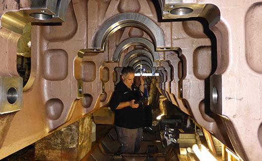 檢查柴油發(fā)動機的主軸承和凸輪軸承(移除相關(guān)軸)位置的直線度。這是通過Linebore系統(tǒng)完成的。一種間接測量是檢查電機底座的直線度,這可能表明機器的設(shè)置/安裝不正確(見圖)。在此處閱讀有關(guān)檢查和對齊柴油發(fā)動機的更多信息。